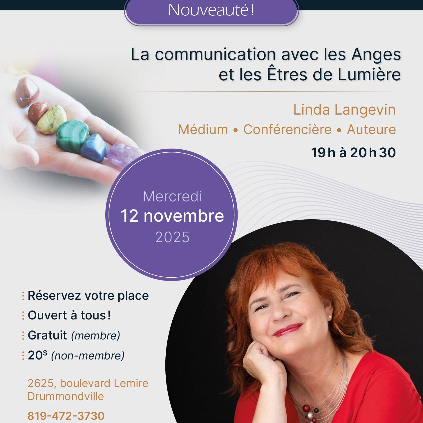 Cette conférence sera présentée par Mme Linda Langevin, médium conférencière et auteure, le mercredi 12 novembre 2025, de 19 h à 20 h 30.